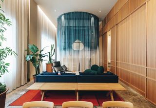 Gästrummens unika karaktär kännetecknas av en genomskinlig 4,5 m cylinder gjord av tyg som stiger från golvet upp till taket. Gardinskena SG 6103 bockad i en cirkel, som på ett fint sätt omsluter den fristående sängen. Det genomskinliga tyget, delvis färgat i indigo, är upplyst av en specialtillverkad rispapperslampa. Alla rummen har infällda gardinskenor, SG 6243. Skira gardiner för att skapa en ljus och skön atmosfär i rummet och ytterligare en gardin med kraftig textil för att kunna mörklägga vid behov.
