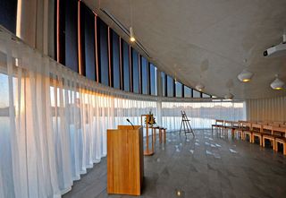 Silent Gliss har installerat ett stort antal motoriserade rullgardiner i de höga glaspartierna och två stora motoriserade gardinskenor på den nedre delen.
